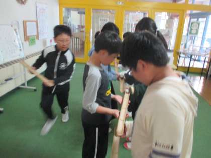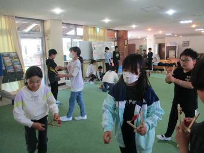 宿泊学習最後の活動はバンブーチャレンジです。竹を使ったおもちゃで各班でルールを作って活動に取り組みました。