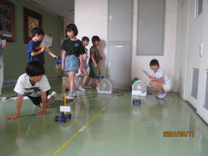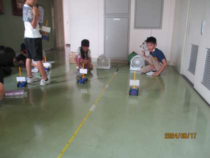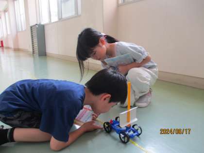 風の強さを変えると車の動き方はどうなるのか、ペアで確認しながら実験をしました。強い風を当てたときに車が勢いよく進むと周りから歓声があがっていました。算数科で学習した、巻き尺を使い方も役立ちましたね。