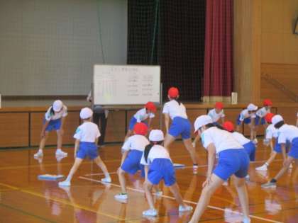 今日は運動記録会。ファミリー班に分かれて、体力テストの4種目を行います。まずは、自分の目当てを決めて体操から始めました。