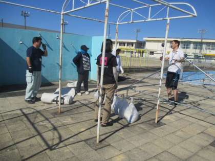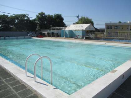 明日のプール開きに向けて、教職員でプールサイドにテントを張りました。これで準備万端。明日のプール開きをプールも待っているようです。