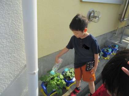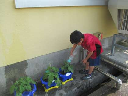 アサガオの水やりをする1年生からは、「大きな葉っぱが3枚もあるよ」「葉っぱのうらはフサフサの手触り」「つぼみが出てきたのかな」と喜びや発見の声が聞かれます。「水をたっぷりあげるよ」と声をかけながら、アサガオに水をやる姿も素敵です。