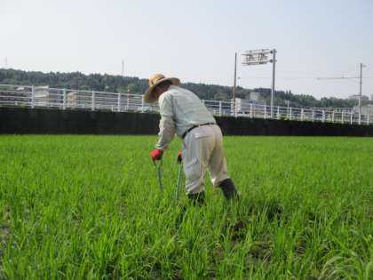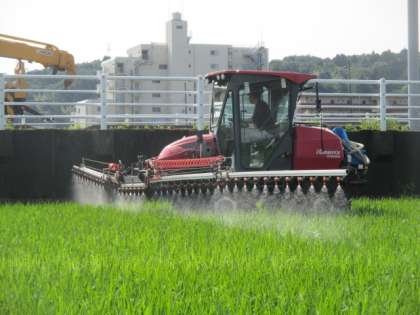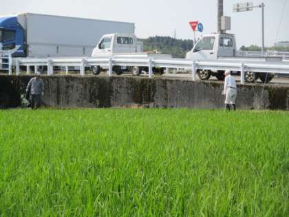 先日、2年生の町たんけんで農作業について教えてくださった地域の方々が、ひまわり田で作業をしておられました。稲が元気に育つために機械で薬をまいたり、溝きりをしたりしてくださいました。校歌の歌詞にもある「科学の力」と「人の力」で、おいしいお米が育つのですね。本当にありがとうございます。