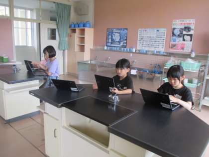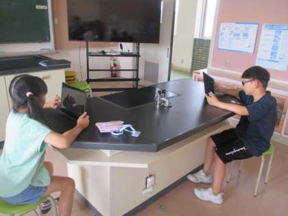 育てているヒマワリ、ホウセンカ、オクラ、ピーマンの様子をクロムーブックで撮影して、観察記録をしています。写真を見ながら、葉や茎の様子について詳しく記録していました。