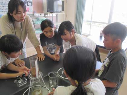 土や砂の粒の大きさによって、水の染み込み方にちがいはあるのでしょうか?「よ〜い、ドン」で水を入れて、水が全て染み込むまでの時間を計ります。大きな違いが出て、驚きの声が挙がっていました。