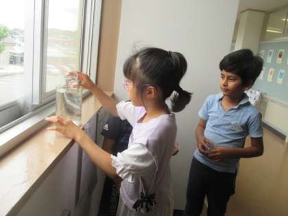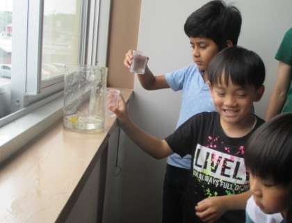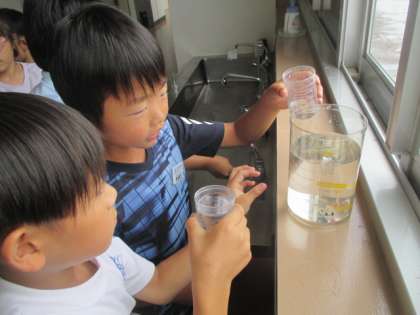 みんなで協力して、1リットルますに1デシリットルのますで10杯分の量が入ることを確かめています。目盛りをよく見て、1デシリットルの水をますに入れるのも上手になりました。1リットル=10デシリットルを体感した子供たちです。