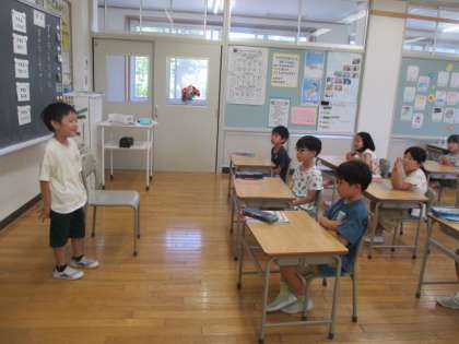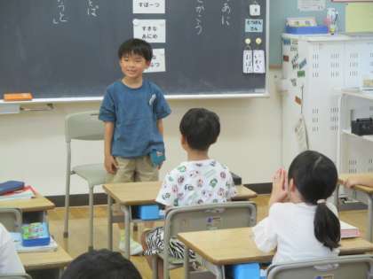 「すきなこと なあに」の発表では、自分の好きなことを理由も説明しながら堂々と発表しています。友達の発表内容に興味をもって聞いている姿も素敵です。