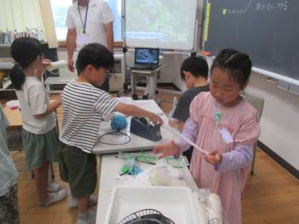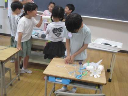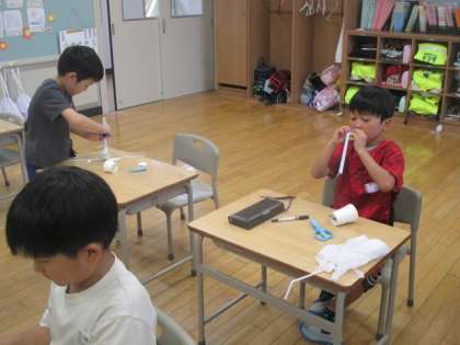 ストローや紙コップ、うちわやモールを使って、シャボン玉をつくる道具を工夫しながらつくっています。