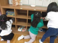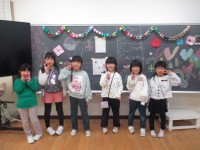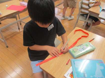 1年生は算数の時間に、紙テープを使って、かめの「デカたん」が泳いでいる水槽の深さと身の回りのものの長さを比べていました。