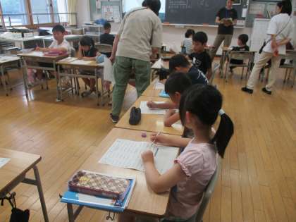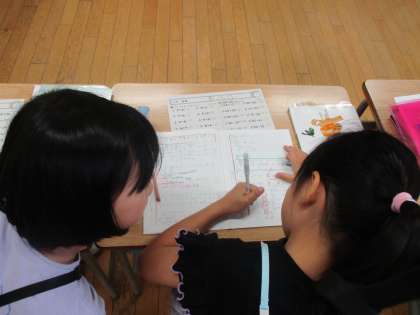 2、3年教室を覗いてみると、算数のまとめに取り組んでいました。いよいよ学期末になったので、学習を振り返ったり、教え合ったりして自分の学びを確認していました。