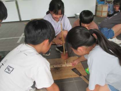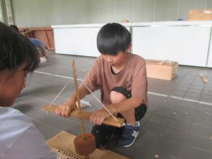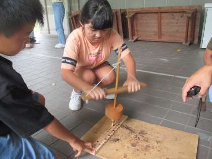 最後に火おこし体験をしました。曇っていて湿度も高く火おこしには、あいにくの天気でしたが、子供たちは、何とか自分たちの力で火おこしを成功させたいと何度も挑戦しました。