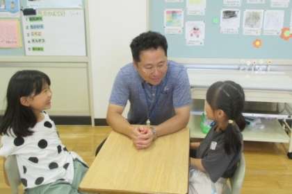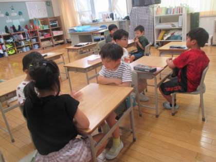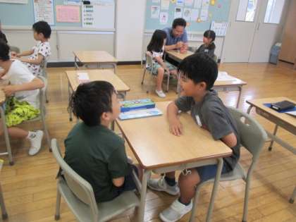 今日伝え合っているのは、得意なことです。友達の話を興味深そうに聞いています。