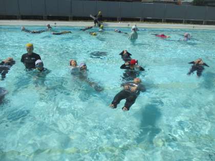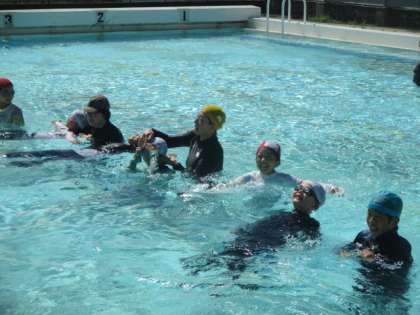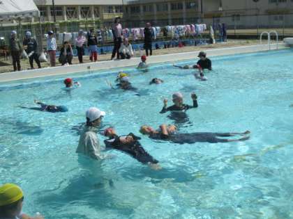子供たちは、力を抜くことや浮き具を適切に使うことで浮くことができることや腕や頭をあげると、体が水に沈んでしまうこと体感しました。かけがえのない自分の命を守る方法を教えていただく貴重な機会となりました。