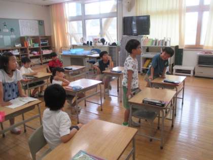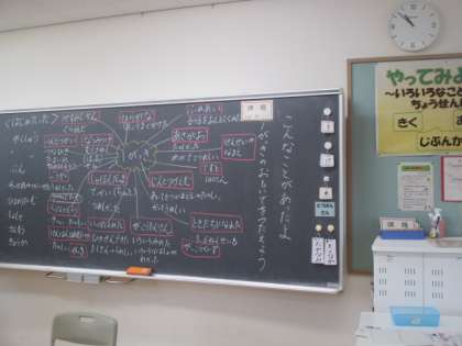 「こんなことしたよ」の学習で、1学期にあった出来事やできるようになったことを出し合いました。「入学したときは先生の名前が分からなかったけど、今は分かるようになったよ」「学校探検でいろいろな部屋に入ったことが嬉しかったよ」など、黒板が一杯になるほどたくさん振り返る1年生の姿に頼もしさを感じました。