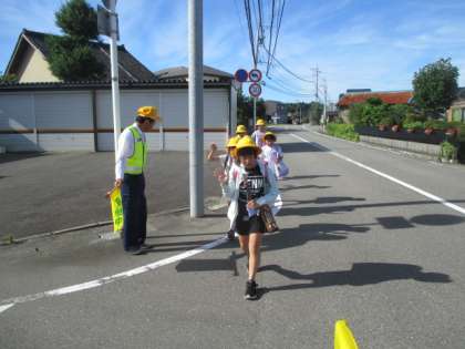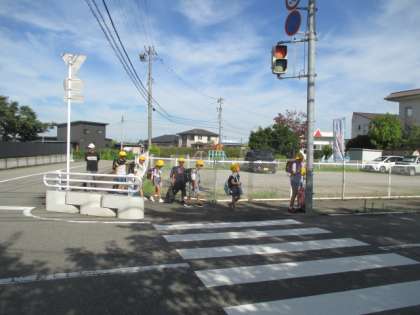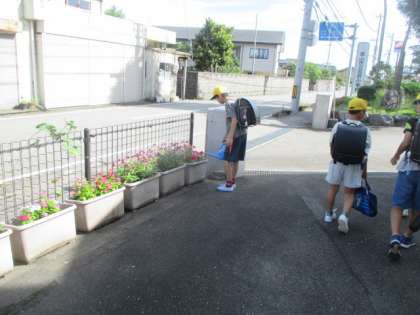 今日も暑い朝です。地域の方に見守られて子供たちが元気に登校しました。「今日のプール楽しみ」という声も聞かれました。高学年は、早速プランターの花に水やりをしています。