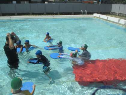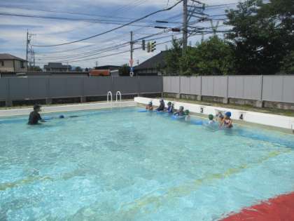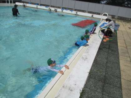 朝から楽しみにしていたプール学習です。顔を水につけたり、もぐったり、けのびをしたり、バタ足をしたり・・・。自分の目当てをもって学習しています。