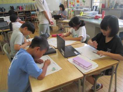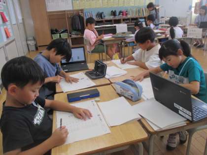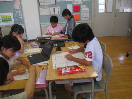 2・3年生のグループで算数の復習に取り組んでいます。自分の目当てをもって学習を進めたり、教え合ったりしている姿が素敵です。