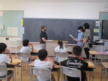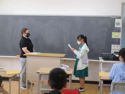 1学期で勤務を終えられるALTの先生に書いた手紙を渡しています。一人一人が英語で手紙を読み終えると、ALTの先生からもみんなからも大きな拍手が沸き起こっていました。