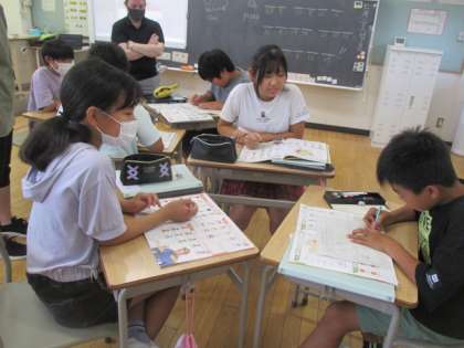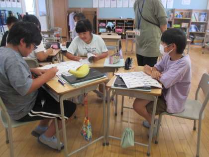 1学期最後の外国語の時間です。グループ対抗戦で英語でしりとりをしています。グループで協力して単語を探し出しています。