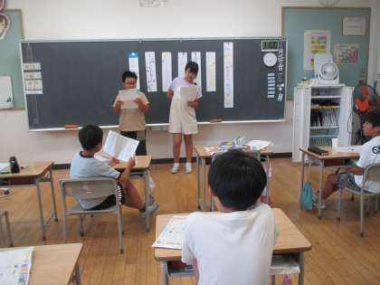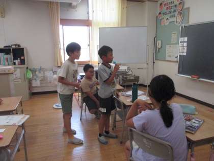 司会や進行、始めの言葉や終わりの言葉など、自分たちでやりました。最後にインタビューをすると、みんなから「楽しかった!!」との声が上がりました。1学期、よく学び、よく遊び、よく笑いましたね。ありがとう。