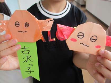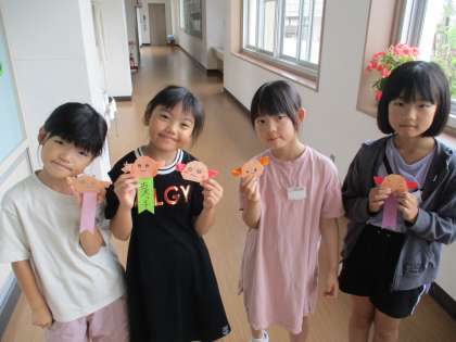 3年生の折り紙が得意な人が、みんなの分のホクリクサンショウウオを作ってくれました。一人一人が好きな顔を描いて、とてもかわいい仕上がりになりました。