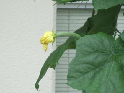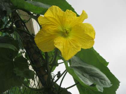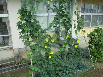 ヘチマは大きく育って、花が咲き始めています。小さな実も見付けました。