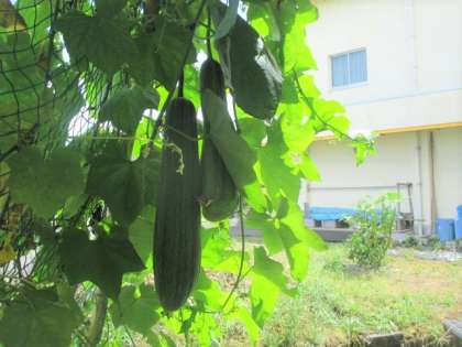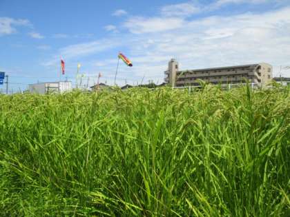 ヘチマは大きな実を付け、学校田の稲穂が風に揺れています。