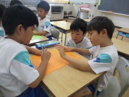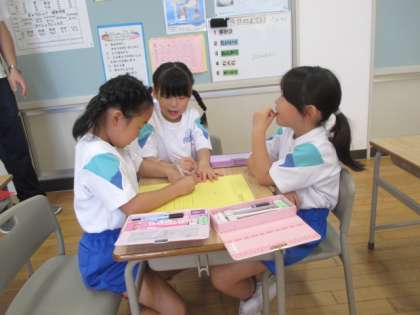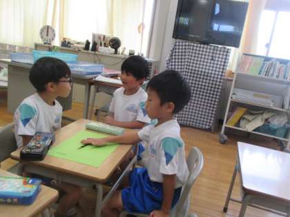 「どんなゲームにする?」「金魚すくいをするときは何がいるかな?」アイディアを出しながら話し合っています。2学期の係活動が楽しみです。