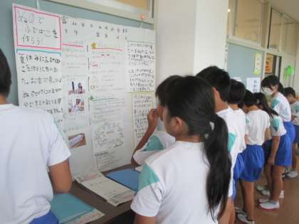 朝活動の時間に5・6年生が夏休みの作品を鑑賞しています。