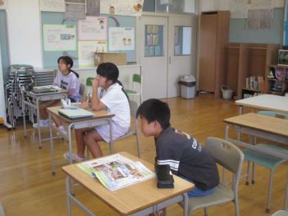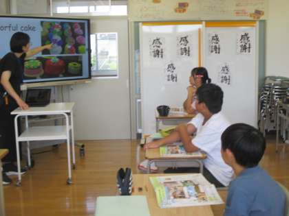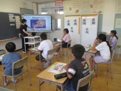 行きたい国についてスライドを使いながら英語で紹介する学習です。専科の先生がアメリカの国のスライドを提示してくださいました。みんな興味津々で見ています。これから自分が行きたい国について調べて紹介します。