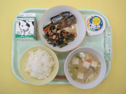 今日の給食の献立は、ごはん、牛乳、だんご汁、大豆とひじきのごま和え、さんまのしょうが味、お月見ゼリー でした。