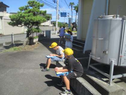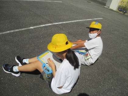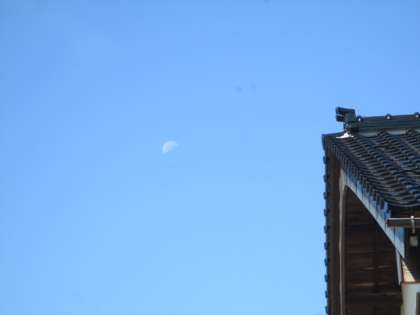 「昼も月が見える」「さっきより動いているね」4年生の子供たちが見つめる先に月がぽっかり浮かんでいます。今日の月の入り時刻は、12時42分です。この後、月はどのように動いていくでしょうね。