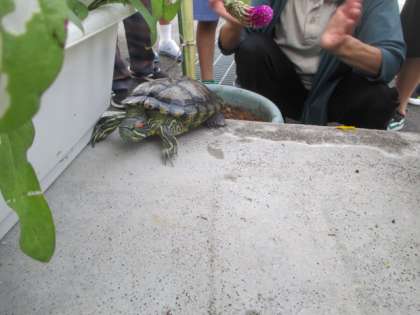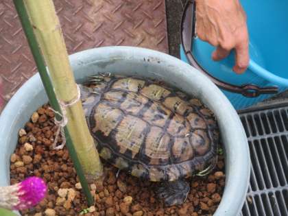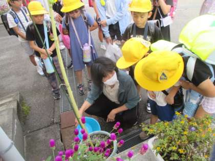 朝の児童玄関前で子供たちが集まっています。カメのでかタンが散歩中にひまわりの鉢に入ってしまいました。「どうするのかなあ」と子供たちが見守る中、でかタンは、ゆっくり鉢から出てきました。