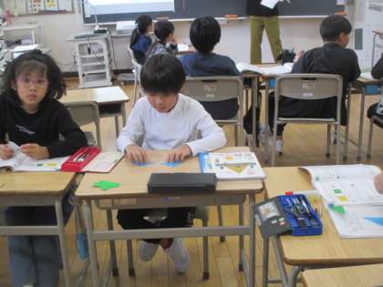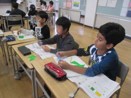 正方形を対角線で切った三角形の秘密は?自分たちで形を組み合わせながら考えています。