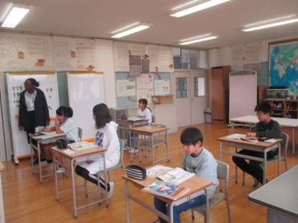 「Where is it from?」身の回りの物がどの国から来たのかを知り、日本と世界のつながりを考えていく学習です。イラストを見ながら英会話を聞き、場面の様子を考えています。