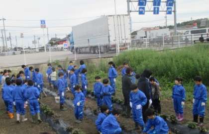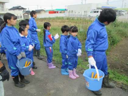 さわやかな秋晴れのもと、ファミリー班でさつまいも掘りをしました。学校裏の畑に古沢っ子が集合です。