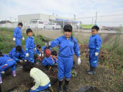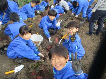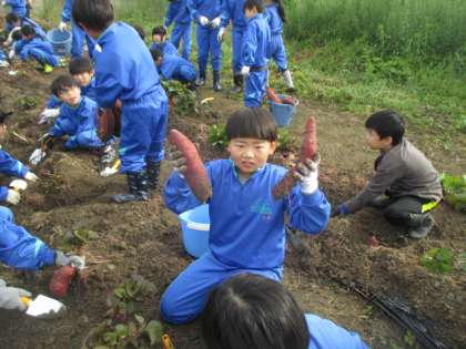 「細くて長いさつまいもだよ」「大きくて形がいいよ」。たくさんのさつまいもがとれて、子供たちは大喜びです。