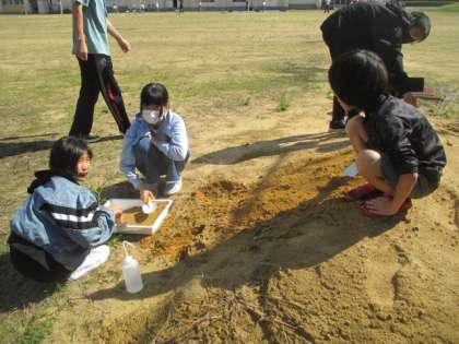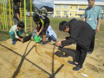 グラウンドの砂山を使い、流れる水の働きを調べています。「どこで水が氾濫するのだろう?」水が流れる様子をクロムブックで撮影しながら実験です。