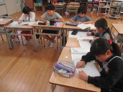 10月17日(木)3年生 国語の時間 公開日 2024/10/17 更新日 2024/10/17 3年 国語の時間は、物語文「ちいちゃんのかげおくり」の学習をしています。場面ごとの様子をじっくりと読み取り、登場人物の気持ちを考えました。一人一人ワークシートに自分の考えを真剣に書いています。 また、物語の中に出てくる道具や食べ物について、自主的に調べてノートにまとめてきた人もいました。知らない言葉を調べることで、物語の内容がより分かるようになりますね。