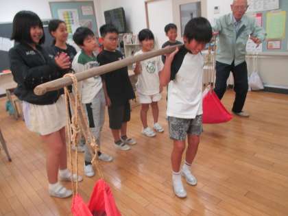 10月22日(火)4年 古沢用水学習 公開日 2024/10/23 更新日 2024/10/23 4年 今日は、スペシャルゲストをお招きして、古沢用水についての学習を行いました。古沢用水ができる経緯や、そのときの人々の苦労を疑似体験させていただきながら学びました。天秤棒を使ってみて、感じたことがたくさんあったようです。今回の学びを、これからの社会の学習に生かしていきます。