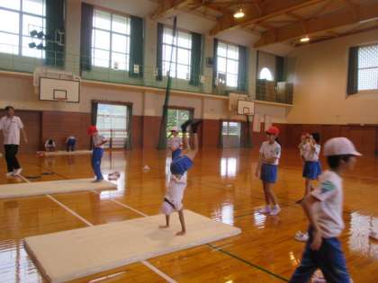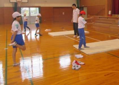 倒立や倒立前転の練習をしています。