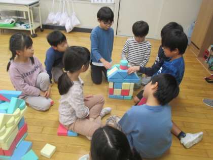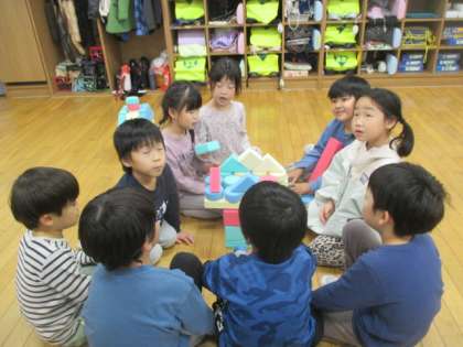 かたちあそびの学習では、色々な形をどのように組み合わせたかを伝え合っています。