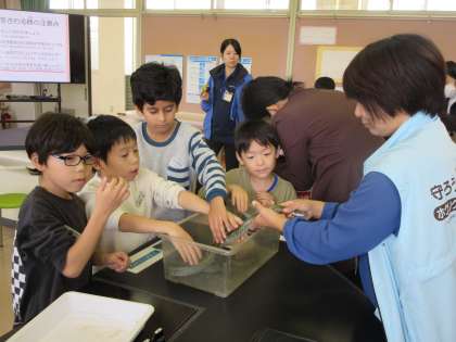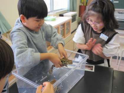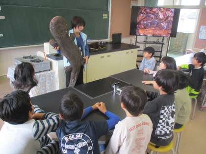 11月13日(水)1、2年生 生活 公開日 2024/11/13 更新日 2024/11/13 最新の出来事 悠久の森ホクリクサンショウウオの出前授業がありました。ファミリーパークから2名の職員の方に来ていただき、呉羽丘陵で暮らす生き物について教えていただきました。実際に生き物たちと触れ合う体験もしました。これからも、自然や生き物を大切に守っていきたいですね。