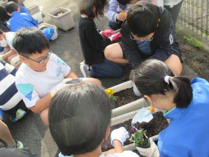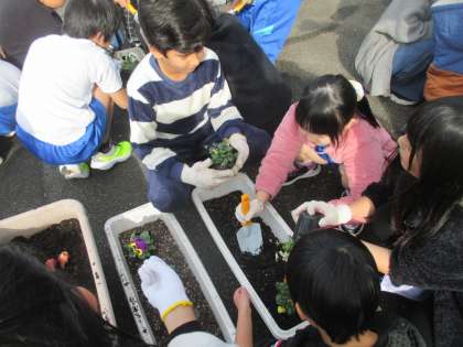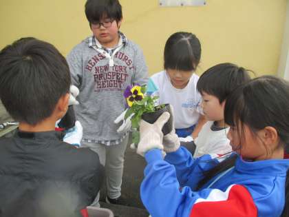 ひまわりタイムにファミリー班でパンジー・ビオラの苗とチューリップの球根を植えました。上級生を中心に協力して植えることができました。春まできれいに咲くといいですね。