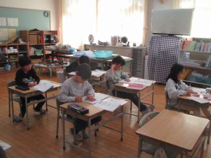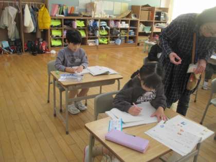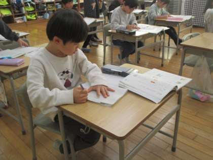 のばす音や小さく書く字に気を付けて片仮名を書いています。のばす音がある片仮名の言葉を思い出しながら、ていねいにノートに書いていました。