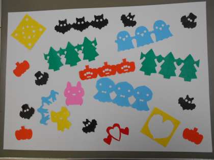 今回は、前回の切り紙よりもパワーアップして難しい作品にチャレンジしました。学校司書の先生が準備してくださった型紙を利用したり、図書室の本を見たりしながら自分の作りたい作品に取り組みました。友達と話しながら、季節に合った作品などいろいろな切り紙に楽しくチャレンジする姿が見られました。