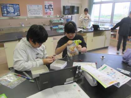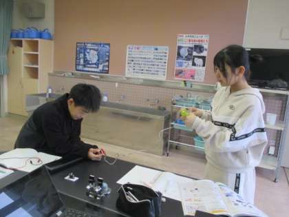 11月27日(水)6年生 理科 公開日 2024/11/27 更新日 2024/11/27 6年 手回し発電機をコンデンサーにつなぎ、ハンドルを回した後、コンデンサーをモーターや豆電球につないで、ためた電気は何に変えて利用できるのかを実験しています。協力して実験を進めています。