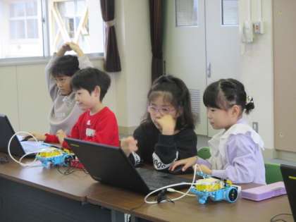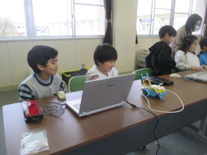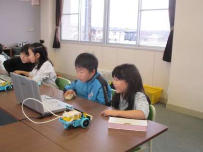 ペアの友達と声を掛け合い、協力しながら、マウスクリックのゲームに取り組んだり、ロボットの車の動きをプログラミングしたりしています。