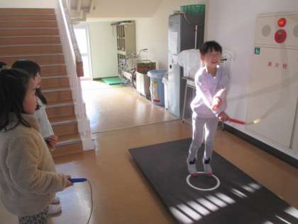 休み時間にジャンピングボードを使って縄跳びの練習です。いろいろな技に挑戦しています。