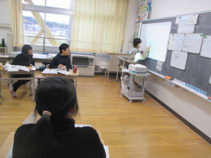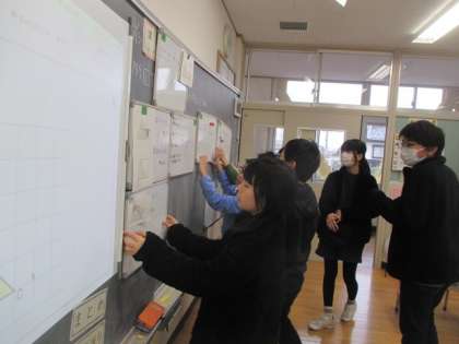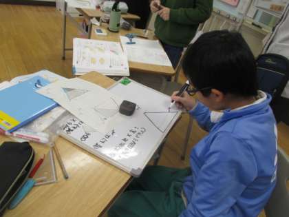 三角形の面積の求め方を考えています。一人一人が考えを書いたホワイトボードを仲間分けした後に、それぞれの求め方について聞き合っています。友達の考えを聞いて「なるほど、三角形は長方形にも変換できるのか」というつぶやきも聞こえてきました。