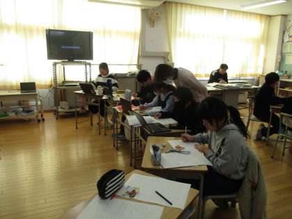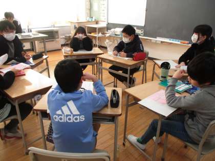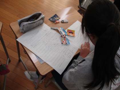 5、6年教室では、6年生がパンフレットづくりに励み、5年生は自分たちが書いた作文を読み合っていました。